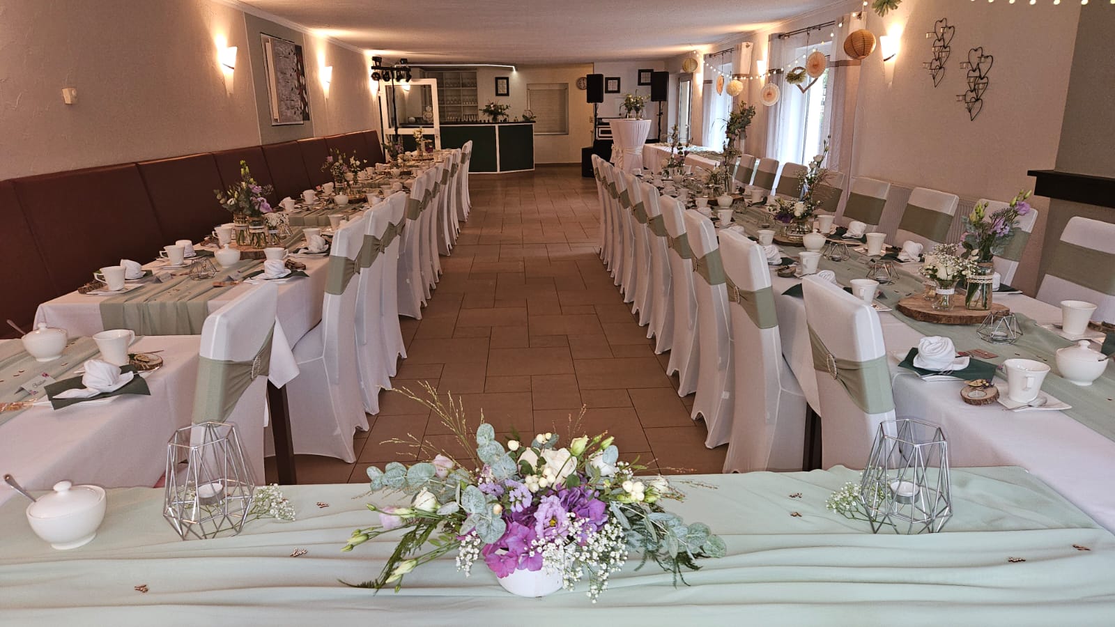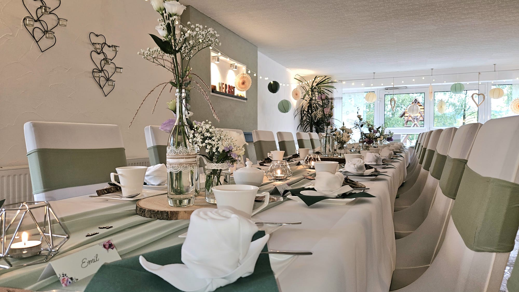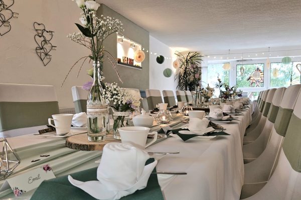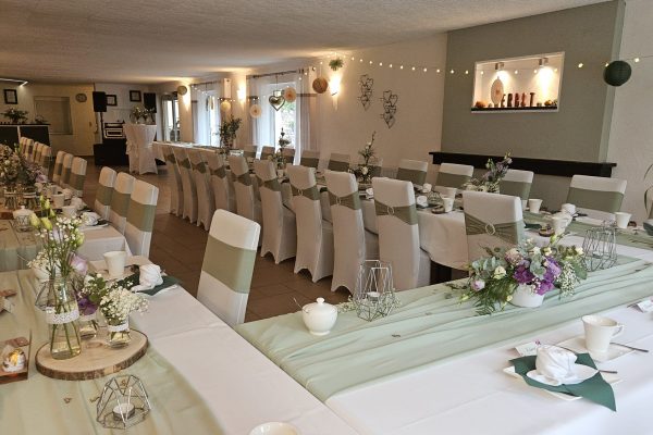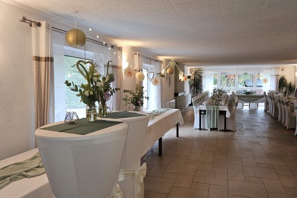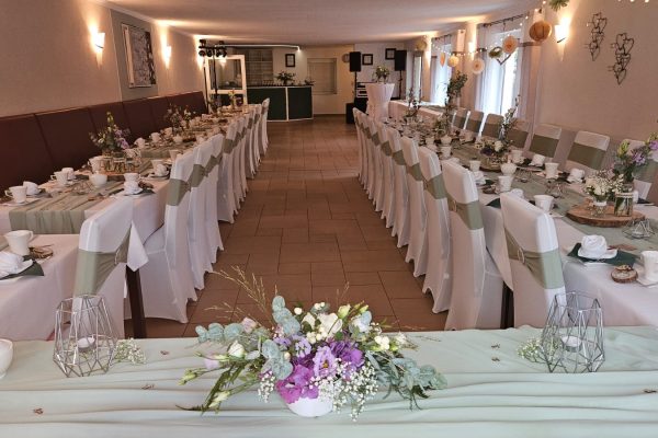 Zu Ihrer Feier erfreuen wir Sie natürlich mit einer individuellen Dekoration ganz nach Ihren Wünschen. Verraten Sie uns einfach, was Sie am liebsten mögen, und wir setzen es für Sie um – von der rustikalen Landhochzeit mit Weizenähren und Kornblumen bis hin zur herbstlichen Kürbis-Deko mit vielen herrlichen Herbstblühern.